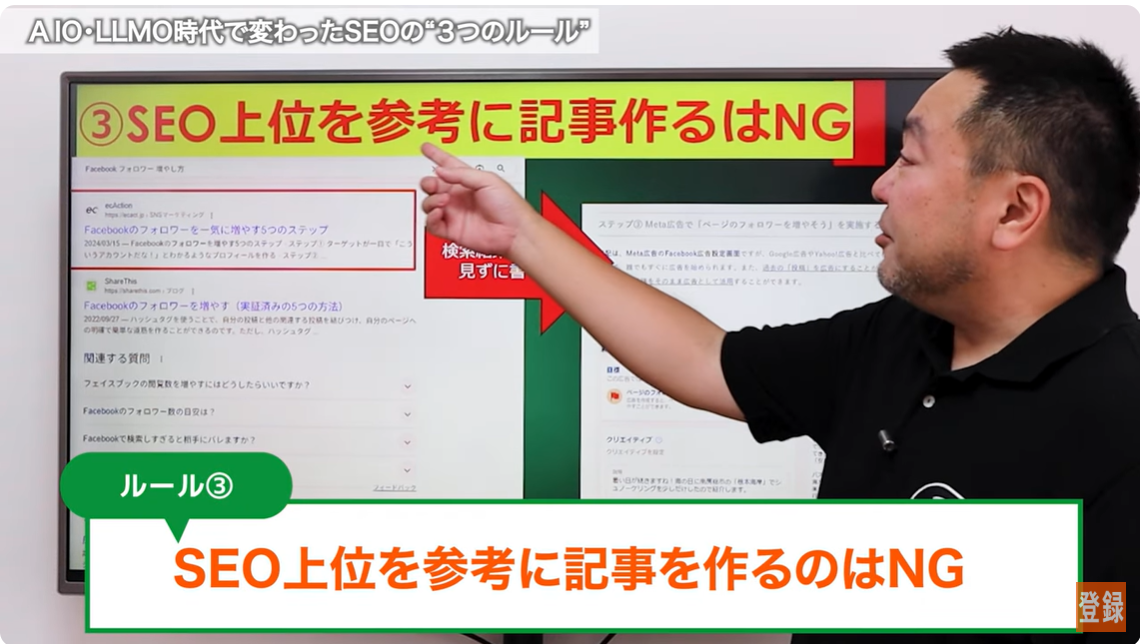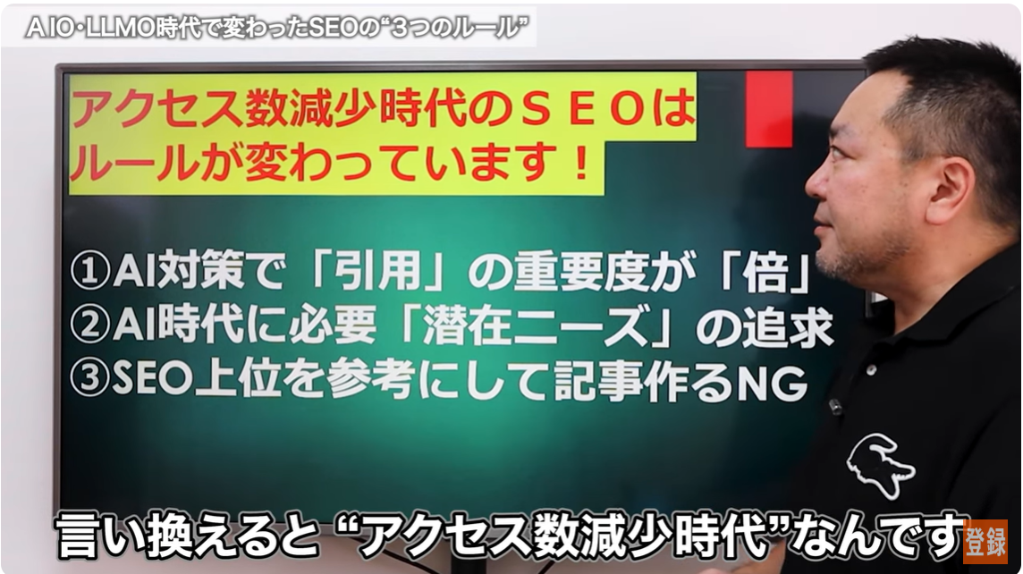 AIO・LLMO時代のSEOは「アクセス減少との戦い」でもあります。その中で成果を出すには、「引用・潜在ニーズ・独自性」という3つのルールを押さえることが欠かせません。