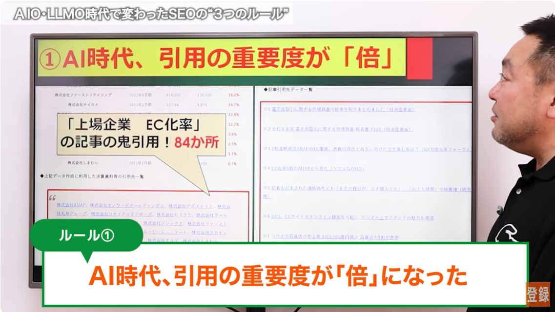 実際の事例では、上場企業のEC化率に関する記事で「84カ所」の引用を行い、独自に導き出した「13.3%」という数値がAIにも取り上げられました。結果的に、Google検索だけでなくChatGPTやClaudeでもその記事が参照されています。