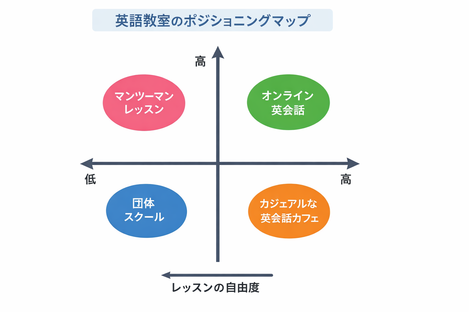 例えば、英語教室を扱う場合でも、読者が迷いやすいポイントを2軸に落とし込むだけで、各サービスの立ち位置が一目で伝わります