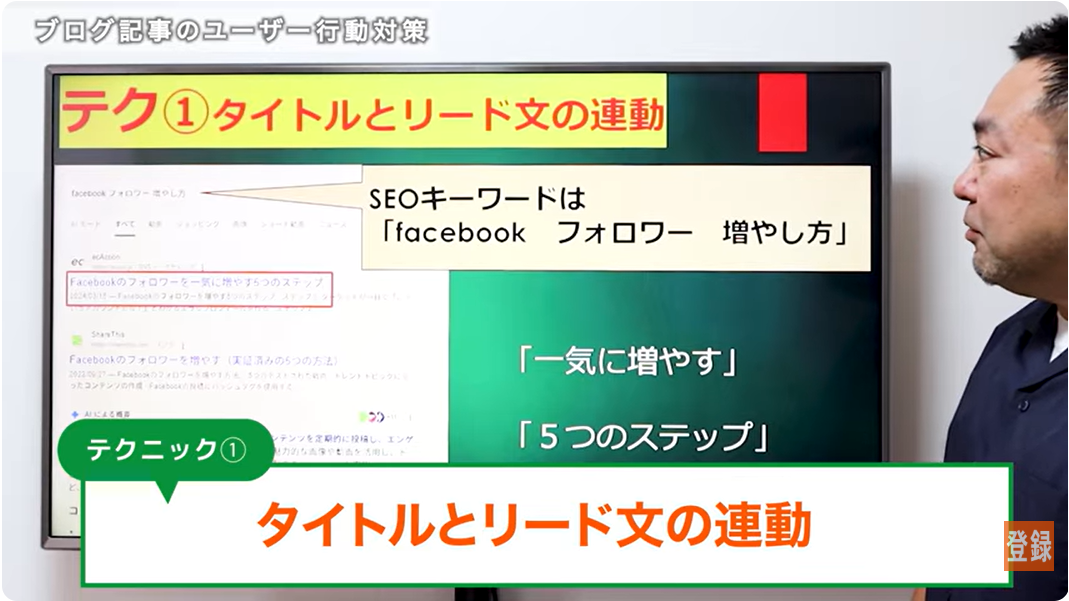 例として、 キーワード:「フェイスブック フォロワー増やし方」 という検索に対しての構成で考えてみましょう。